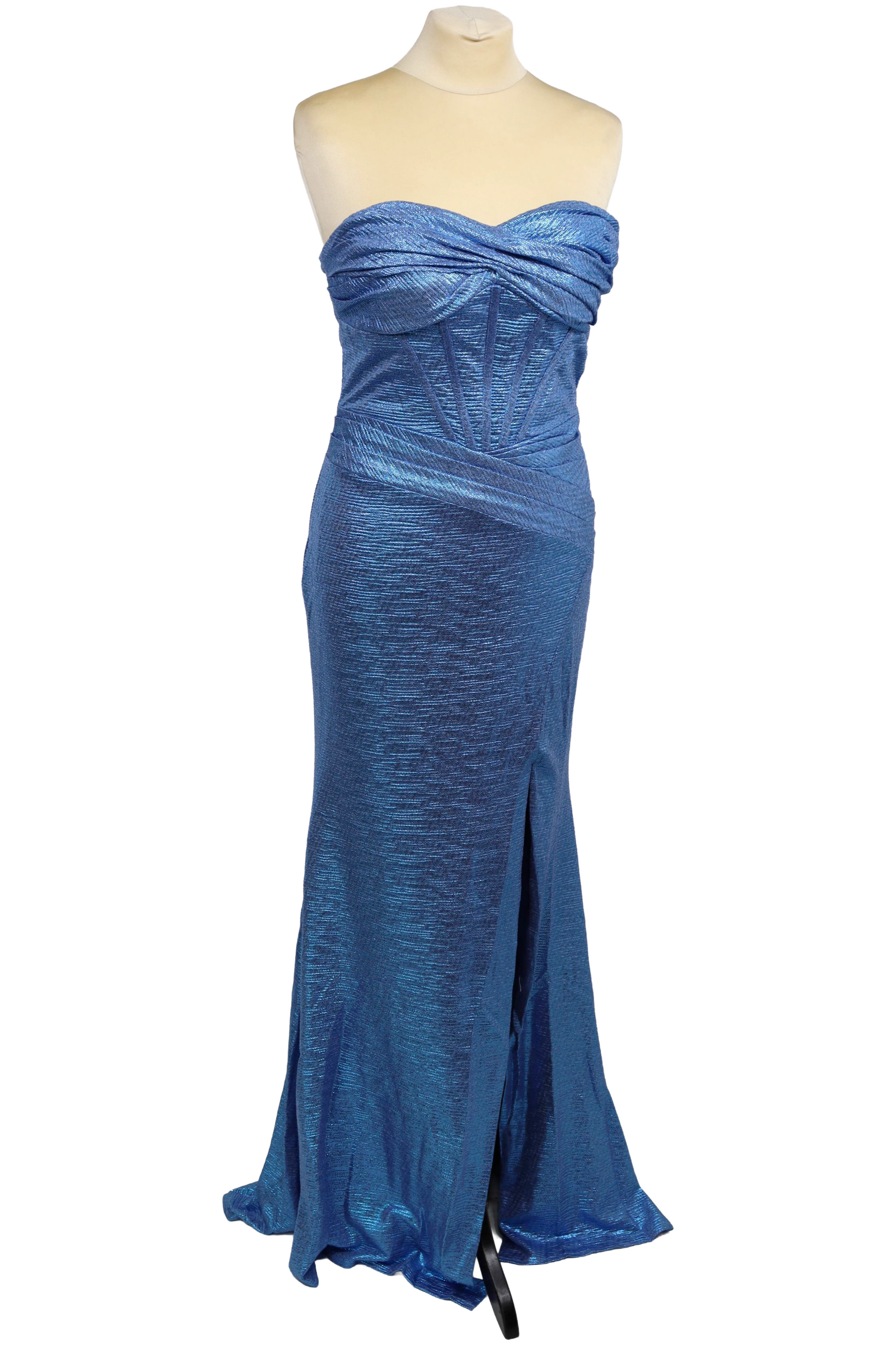 Vestido metálico azul destaca-se pela sua elegância e brilho sofisticado