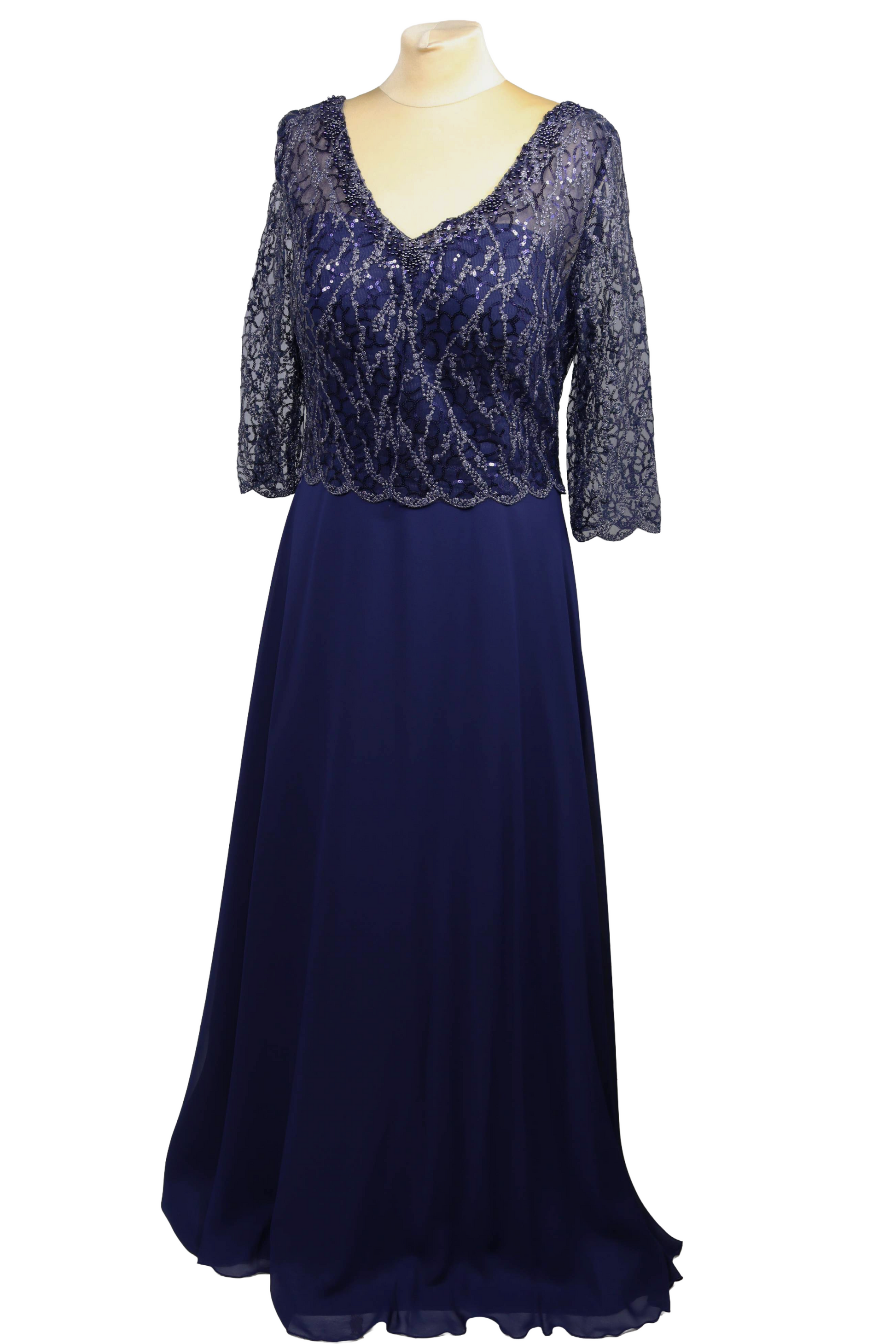 As mangas três quartos em renda transparente acrescentam leveza e requinte, equilibrando perfeitamente com a saia longa e fluida, que garante conforto e movimento natural. Um modelo clássico e versátil, ideal para casamentos, cerimónias formais e ocasiões especiais