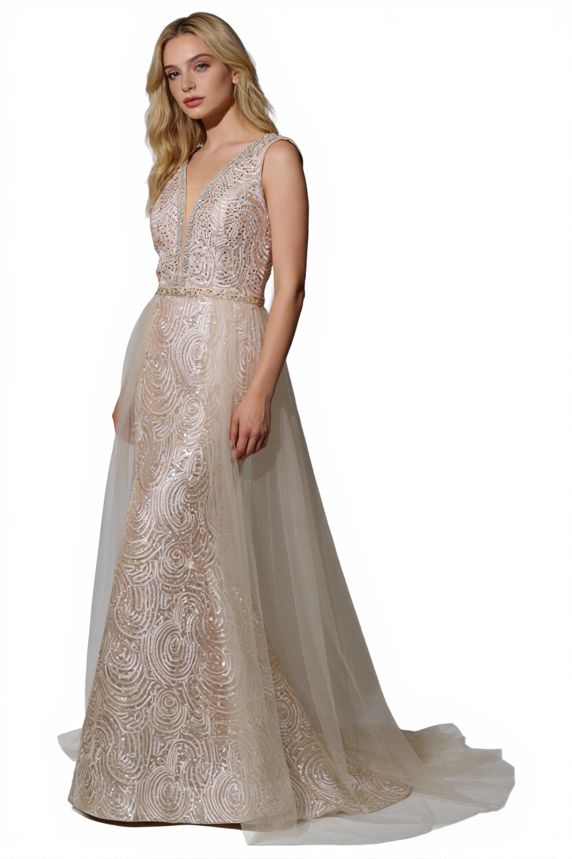 O decote em V profundo, com transparência discreta, valoriza o colo de forma elegante, enquanto a cintura marcada realça a silhueta feminina. A saia longa com sobreposição de tule fluido acrescenta leveza, movimento e um toque romântico ao look.