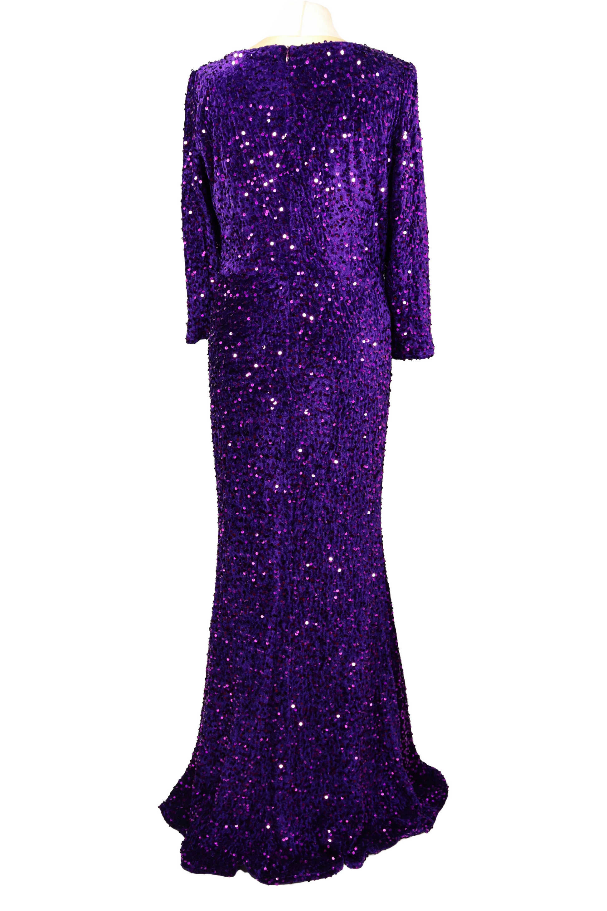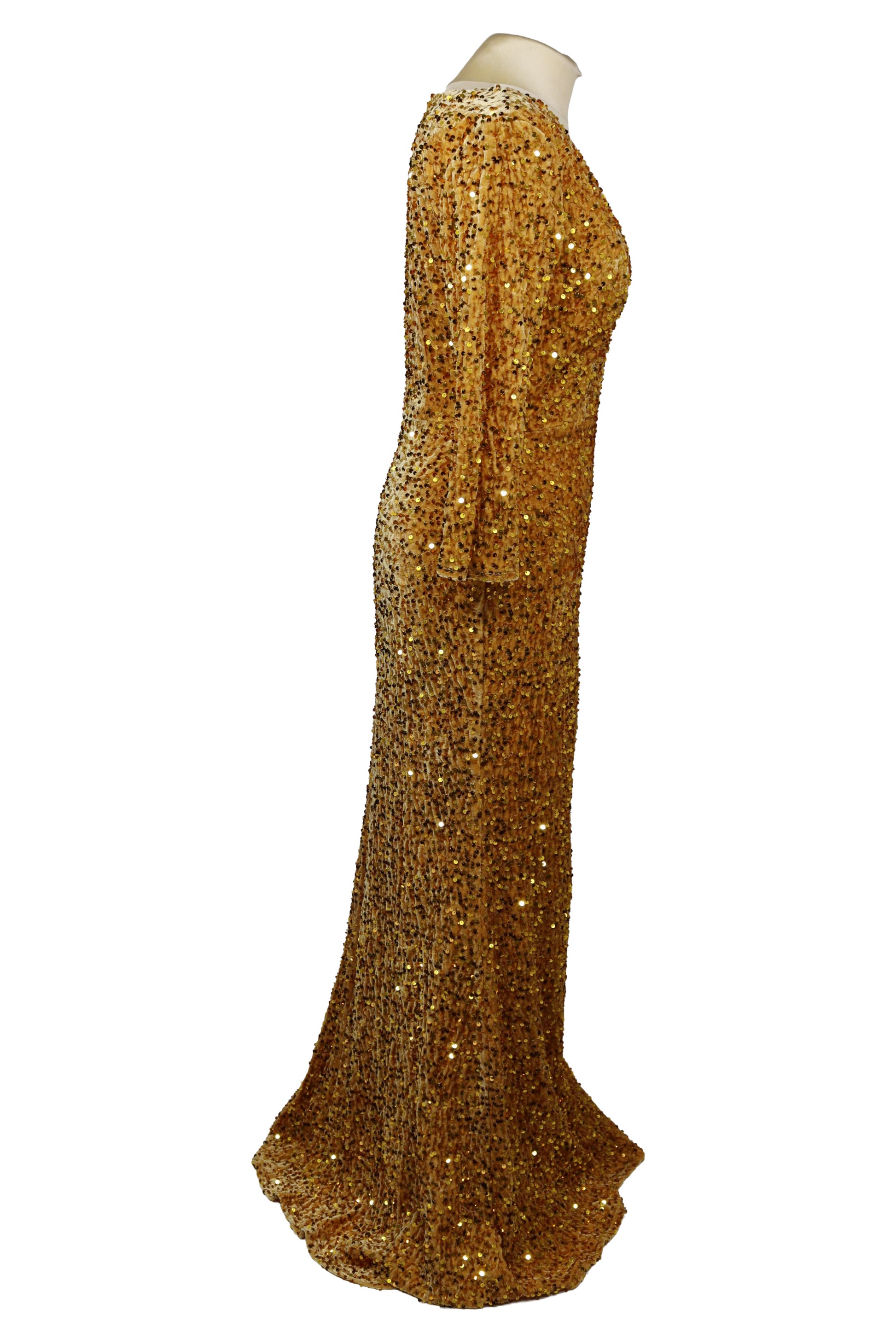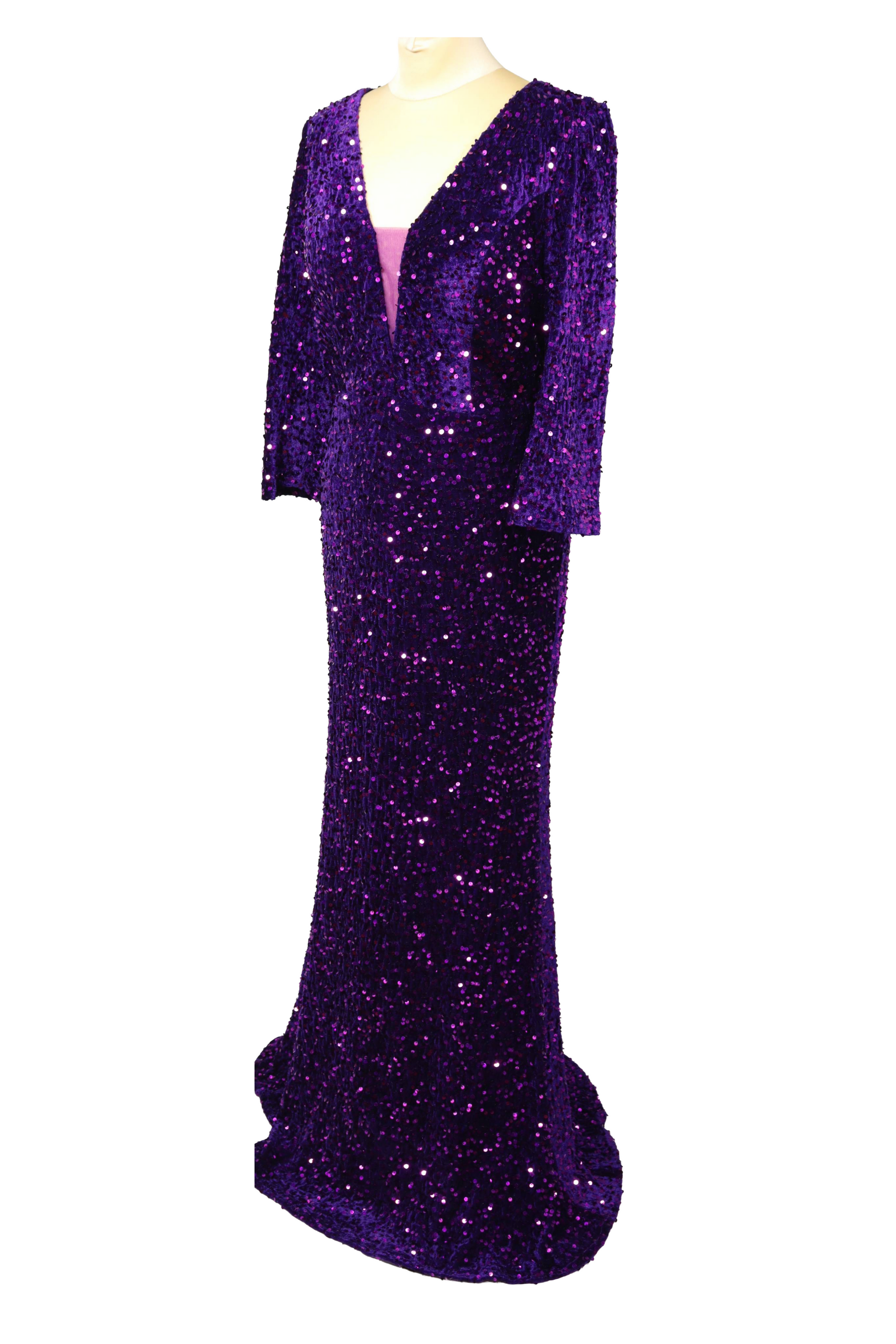 Este vestido longo é a escolha perfeita para quem procura impacto, elegância e conforto numa só peça. Confeccionado em veludo macio e maleável, totalmente coberto por lantejoulas, oferece um brilho sofisticado sem comprometer o conforto, adaptando-se ao corpo com um excelente caimento